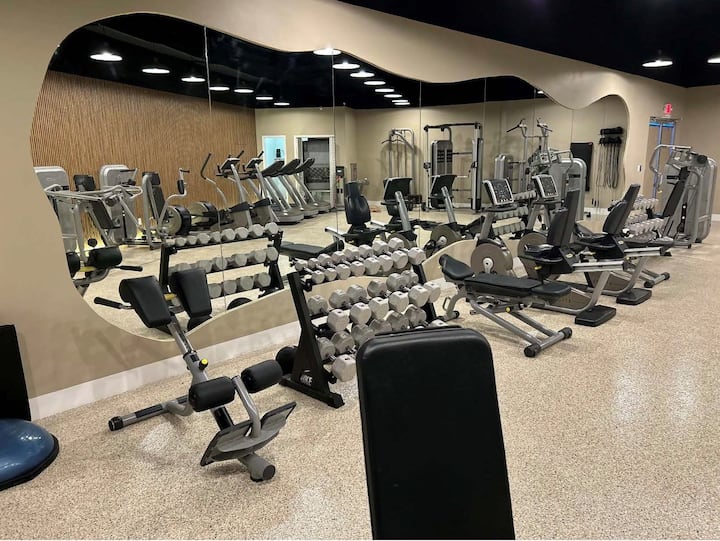 มีเครื่องวิ่งสายพาน จักรยานปั่นอยู่กับที่ เสื่อโยคะ และอุปกรณ์ยกน้ำหนักสำหรับออกกำลัง