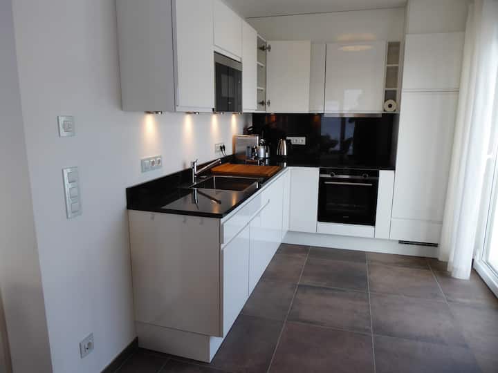 ห้องครัวแบบเปิดพร้อมเตาไฟฟ้า 2 แผงและแผงเหนี่ยวนำเคลื่อนที่เพิ่มเติมเตาอบไมโครเวฟเครื่องล้างจานตู้เย็น/ตู้แช่แข็งเครื่องชงกาแฟ