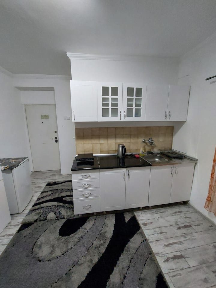 สตูดิโอเป็นแบบพื้นฐานไม่หรูหรามีเครื่องปรับอากาศห้องครัวเล็กๆ