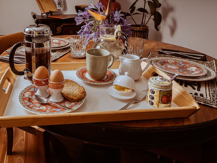 ตะกร้าอาหารเช้าต้อนรับประกอบด้วยขนมปังอบสดใหม่ ไข่ไก่เลี้ยงแบบเปิดโล่ง นมเต็มมัน เนย แยม/น้ำผึ้ง กาแฟบดสดใหม่ และชาเพื่อเริ่มต้นวันหยุดของคุณ นอกจากนี้ยังมีเครื่องเทศ เครื่องปรุงรส น้ำมันมะกอกบริสุทธิ์พิเศษ/น้ำส้มสายชูบัลซามิก ทุกอย่างที่คุณต้องการเพื่อเพลิดเพลินกับอาหารหรือจานที่ทำเองที่บ้าน