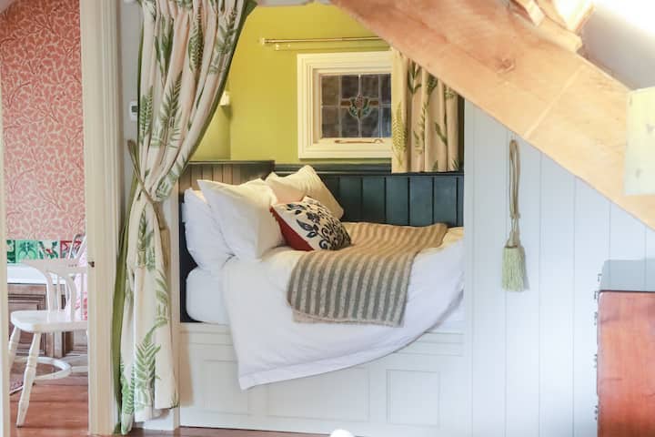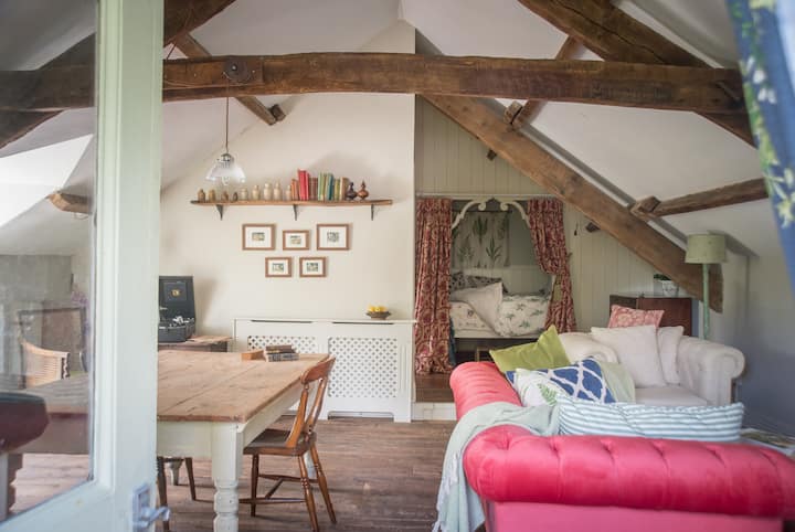 ห้องใต้หลังคาสไตล์โบโฮ มีระเบียงสำหรับดูดาวและกองไฟ และเตียงนุ่ม
