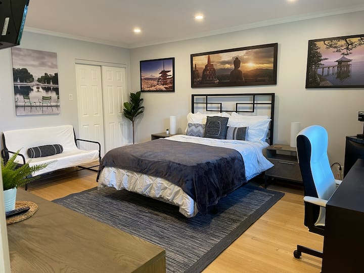 ห้องนอนใหญ่สไตล์ร่วมสมัยและห้องน้ำในตัว