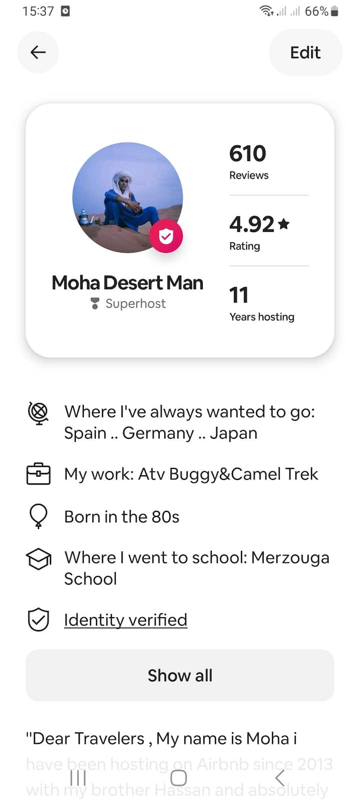 '' เรียนนักเดินทางฉันชื่อโมฮาฉันให้เช่าที่พักบน Airbnb มาตั้งแต่ปี 2013 กับฮัสซันน้องชายของฉันและเรารักและสนุกกับการพบปะผู้คนใหม่ๆและทำความคุ้นเคยกับวัฒนธรรมอื่นๆ เรากระตือรือร้นเกี่ยวกับกิจกรรมกลางแจ้งเช่นการขี่อูฐที่มีการพักค้างคืนที่เบอร์เบอร์แคมป์ในทะเลทรายซาฮาราหรือนั่งรถ ATV Quad หากคุณต้องการ