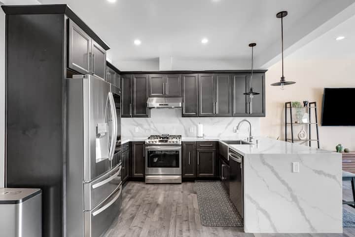 - ห้องครัวเชฟมีอุปกรณ์ครบครันพร้อมเคาน์เตอร์หินอ่อนด้านบนและเตาแก๊ส