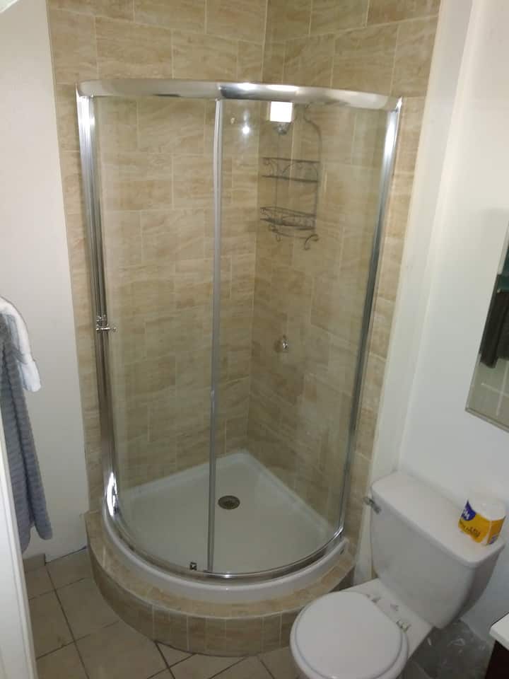 มู่ลี่แนวตั้งห้องอาบน้ำปูกระเบื้องเต็มรูปแบบพร้อมอ่างอาบน้ำและฝักบัว 1 ห้องที่ได้รับมอบหมายที่จอดรถแบบมีประตูรั้วฟรีในสถานที่