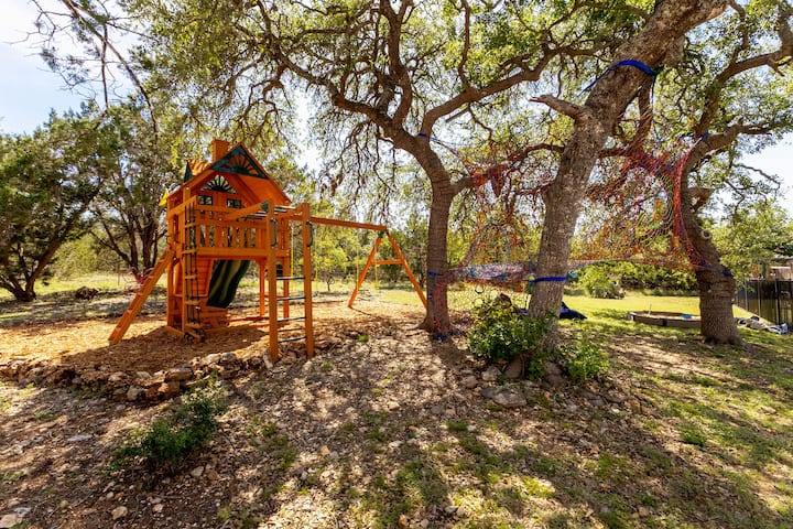 สวรรค์✧ สำหรับเด็ก – ม่านตาข่ายที่ติดตั้งบนกิ่งไม้ของต้นโอ๊ค มีแซนด์บ็อกซ์ “แร็พเตอร์ดิ๊ก” ชุดเล่นใหม่เอี่ยม และเส้นทางเดินป่าส่วนตัวที่มีม้านั่งและชิงช้า