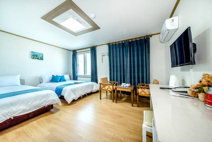 ที่พักนี้มีทะเลสีฟ้าของเชจูและความสะดวกสบายเหมือนอยู่บ้าน!