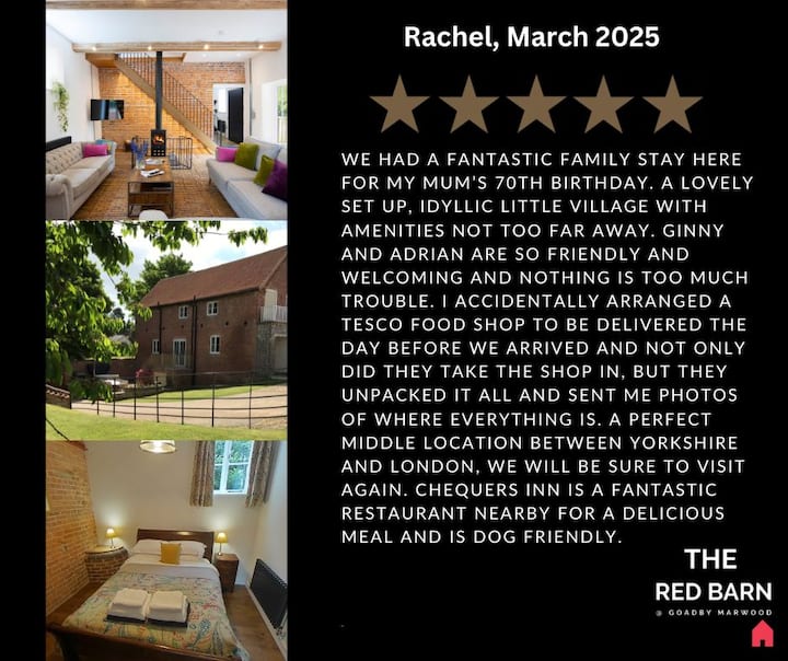 ผู้ก่อตั้ง The Red Barn ที่ Goadby Marwood เราอาศัยอยู่ใน Stable House ถัดจาก Red Barn เราได้ทำงานกับ Red Barn ด้วยตัวเองเพื่อให้แน่ใจว่าอาคารที่จดทะเบียนอายุ 250 ปีนี้มีความหวังว่าจะมีอายุ 250 ปีขึ้นไปอีก 250 ปี เราเปิดตัว The Red Barn ในเดือนสิงหาคม 2020 มีผู้เข้าพักที่ยอดเยี่ยมมากมายและยินดีที่ได้รับรีวิวดีๆทางออนไลน์ เราอาศัยอยู่ใน Goadby Marwood มานานกว่า 7 ปีกับลูก 2 คนลาบราดอร์สีดำและคอกเกอร์ที่ทำงาน เรารักพื้นที่นี้เพราะทิวทัศน์ที่สวยงามผับในหมู่บ้านที่ยอดเยี่ยมในเวลเดินเล่นและปั่นจักรยาน