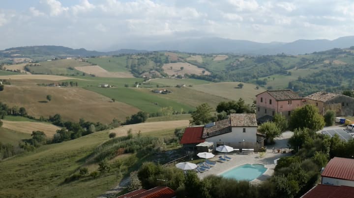 “casa rosa” จุ่มลงในเนินเขานุ่มๆของ Macerata และชี้ให้เห็นบนเทือกเขา Sibillini ในตำแหน่งพาโนรามาที่ระดับความสูง 400 ม.