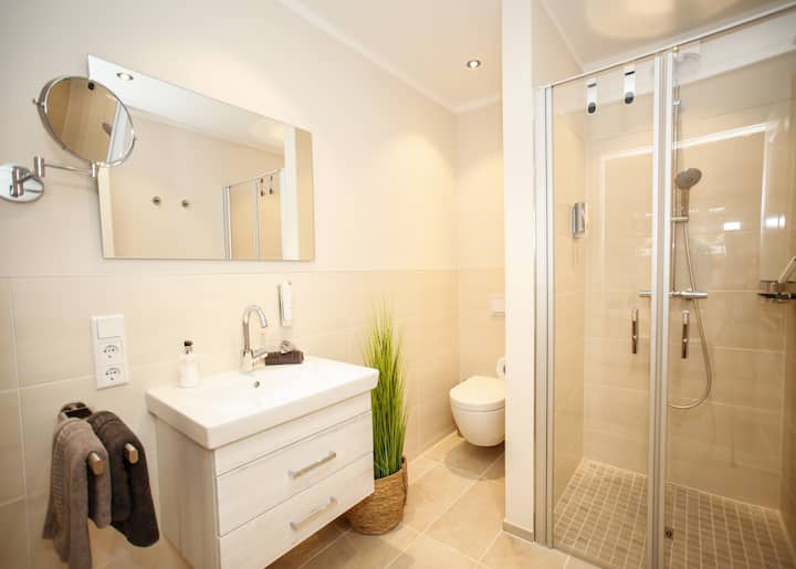สว่างพิเศษและใกล้ชายหาด อพาร์ทเมนท์ของเราในบ้าน Vier Jahreszeiten (2 -4 คน) เต็มไปด้วยแสงและตกแต่งด้วยเฟอร์นิเจอร์ BoConcept ที่ทันสมัยและกลิ่นอายของเกาะ เตียงสองชั้นของกัปตันและอพาร์ทเมนท์ Am Teich ได้รับการปรับปรุงใหม่ในปี 2023 และสร้างความประทับใจให้กับทำเลใจกลางเมืองความเป็นกันเองและความสะดวกสบายในการใช้ชีวิตที่ทันสมัย