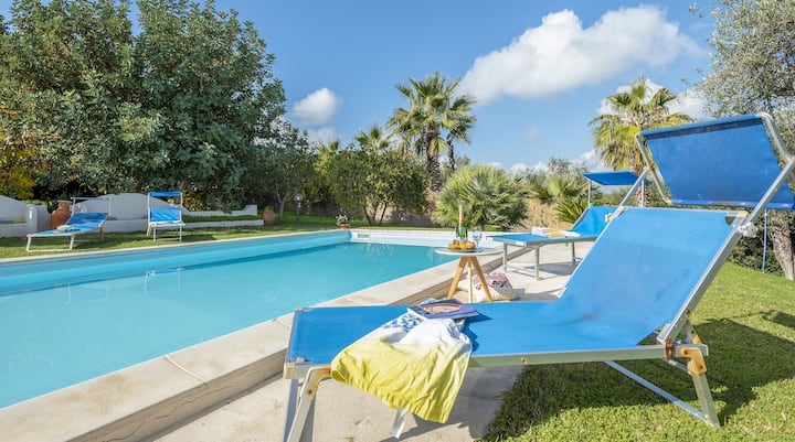 สามารถเข้าถึงได้ผ่านบันไดรูปพระจันทร์ครึ่งดวงที่สวยงาม สระว่ายน้ำตั้งอยู่บนระเบียงที่ชั้นล่างเล็กน้อยด้านหน้าวิลล่าและวางกรอบไว้ด้านหน้าด้วยต้นมะกอกที่ล้อมรอบที่พัก รอบๆเป็นพื้นที่ขนาดใหญ่ที่ร่มรื่นด้วยต้นไม้และมีเก้าอี้อาบแดดมีเก้าอี้อาบแดดและฝักบัวอาบแดด