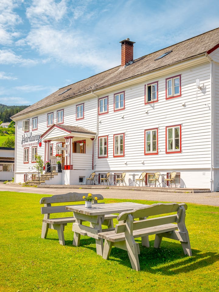 เป็นข้อมูลอ้างอิงสำหรับที่พักในฮาร์เดนเจอร์มาหลายสิบปี มุ่งเน้นไปที่การบริการลูกค้าและพยายามทำให้ผู้เข้าพักของเรารู้สึกเหมือนอยู่บ้านเสมอ บรรยากาศโดยรอบของเกสต์เฮาส์ของเรามีความสุขมากกับฟยอร์ดที่สวนหลังบ้านของเราภูเขาโอบกอดเราและฟาร์มแอปเปิ้ลทั่วทุกที่ คุณคงไม่มีอะไรมากไปกว่าบรรยากาศฮาร์ดเกอร์เกินกว่าในอุลวิค