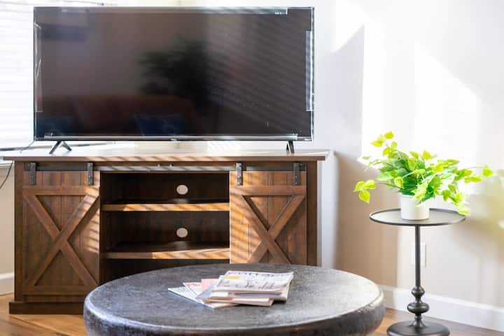 ห้องนั่งเล่นชั้นหลักสว่างและน่าอยู่ มีเก้าอี้นอนหนังและสมาร์ททีวีจอแอลเอชดีขนาดใหญ่พร้อมแอปสตรีมมิ่งที่คุณชื่นชอบ เป็นที่พักที่อบอุ่นเหมาะสำหรับการพักผ่อนหรือเพลิดเพลินกับค่ำคืนดูหนัง