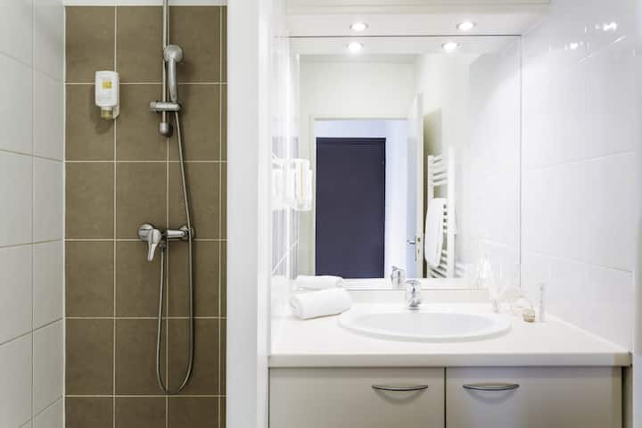 เตรียมพร้อมสำหรับวันของคุณใน 1 ห้องน้ำพร้อมฝักบัวอาบน้ำ รวมผ้าปูที่นอนสำหรับอาบน้ำแล้ว! ขอเปลี่ยนชุดหรือชุดใหม่ในราคา €9/ ชุด