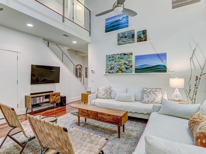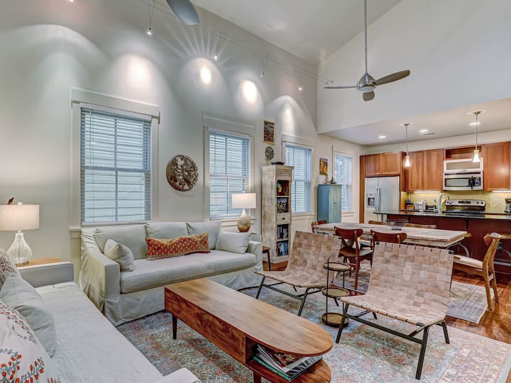 เพดานสูงและหน้าต่างที่เต็มไปด้วยแสงธรรมชาติทำให้ Forsyth Artist Retreat เป็นบ้านพักตากอากาศที่น่าเพลิดเพลินอย่างเห็นได้ชัด ทาวน์โฮมสะวานนาห์แห่งนี้มีแผนการอยู่อาศัยแบบเปิดโล่ง พื้นที่รับประทานอาหารห้องนั่งเล่นและห้องครัวขนาดใหญ่ทอดยาวข้ามชั้นล่างในขณะที่ห้องใต้หลังคามองเห็นพื้นที่นั่งเล่น พื้นที่หลักนี้มีพื้นที่พบปะสังสรรค์สำหรับกลุ่มวันหยุดพักผ่อนของคุณในขณะที่ห้องนอนแยกต่างหากเพื่อให้คุณมีความเป็นส่วนตัวเล็กน้อย