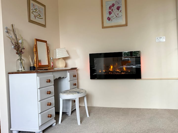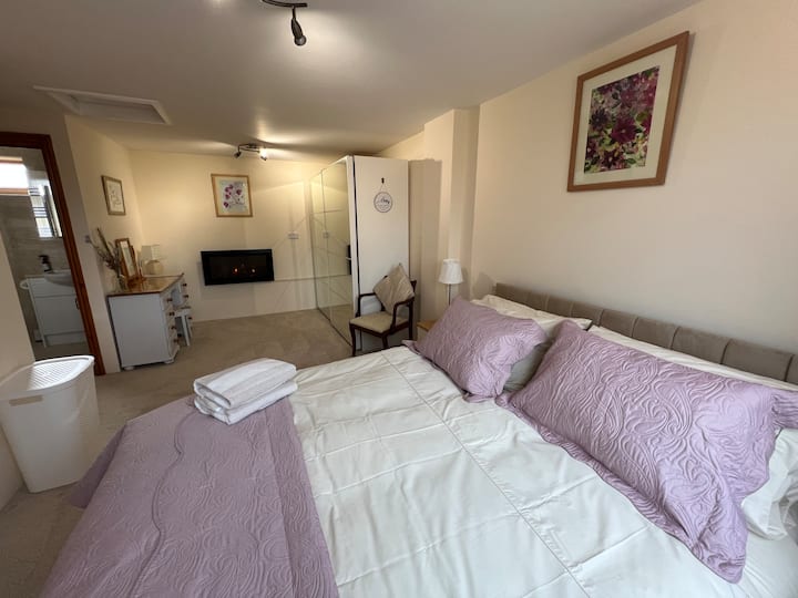 ห้องนอนตกแต่งอย่างสวยงามด้วยสมาร์ททีวี ตู้เสื้อผ้ากระจกขนาดใหญ่ และโต๊ะเครื่องแป้ง มันอยู่ห่างจากบ้านหลักและแยกออกจากประตูภายในที่ล็อค ทำให้คุณมีความเป็นส่วนตัวอย่างสมบูรณ์ ทางเข้าอิสระจากถนน และที่จอดรถของคุณอยู่ด้านนอกประตูของคุณโดยตรง