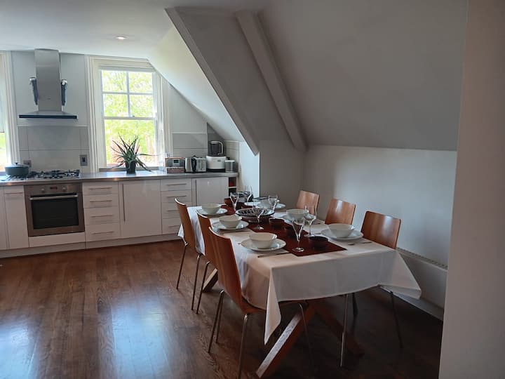 พื้นที่นั่งเล่น ห้องรับประทานอาหาร และห้องครัวแบบเปิดโล่งกว้างขวางแสดงให้เห็นถึงลักษณะร่วมสมัยของที่พักนี้ - พื้นไม้ งานศิลปะ ห้องครัวที่มีอุปกรณ์ครบครัน และโต๊ะรับประทานอาหารขนาดใหญ่ที่สมบูรณ์แบบสำหรับนั่งเล่นกับเพื่อนและครอบครัว มีวิวสวยงามเหนือพื้นที่สีเขียวเหมาะสำหรับการชมพระอาทิตย์ตก