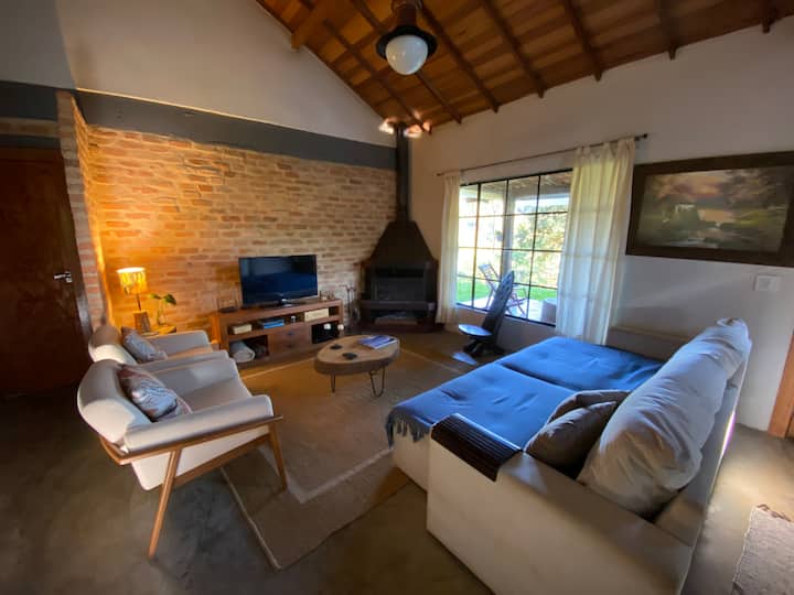 ทางเข้าบ้านมีประตูไม้กว้าง 2 เมตรและประตูกระจกภายในมองเห็นวิวเขียวขจีได้กว้าง เมื่อเข้ามาในบ้านทางขวามือคือห้องนั่งเล่นพร้อมโซฟาที่เปลี่ยนเป็นเตียงคู่ขนาดใหญ่ได้ จุดเด่นของห้องคือเตาผิงเหล็กสไตล์กองทัพเรือที่ทำให้ห้องอบอุ่น ห้องพักยังมีเก้าอี้นวมอีก 2 ตัวชั้นวางไม้พร้อมโทรทัศน์ขนาด 40 นิ้วพร้อมสัญญาณดาวเทียม SKY และอุปกรณ์โครเมคาสต์เพื่อเข้าถึงเน็ตฟลิกซ์และยูทูบ นอกจากนี้ยังมีโต๊ะที่มีเสน่ห์พร้อมโคมไฟ พื้นห้องนั่งเล่นปูด้วยพรมไซซอลและโต๊ะเตี้ยที่มีสไตล์มากทำจากลำต้นไม้ จากห้องพักสามารถมองเห็นวิวหุบเขาได้