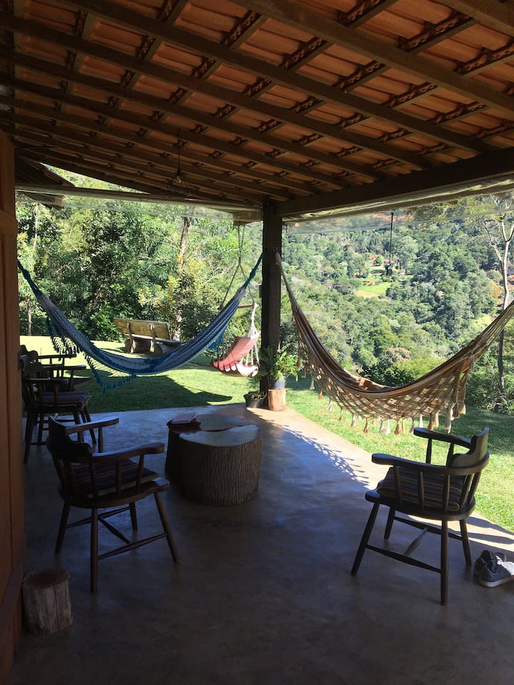 บนระเบียงมีโต๊ะและธนาคาร 2 แห่งสำหรับมื้ออาหาร เรายังมีชุดเก้าอี้ 4 ตัวและโต๊ะเล็กๆที่ทำจากต้นไม้เพื่อเพลิดเพลินกับธรรมชาติและวิวหุบเขาอันเขียวชอุ่มโดยไม่ต้องออกจากบ้าน นอกจากนี้ยังมีเครือข่าย 2 เครือข่ายและงบดุล