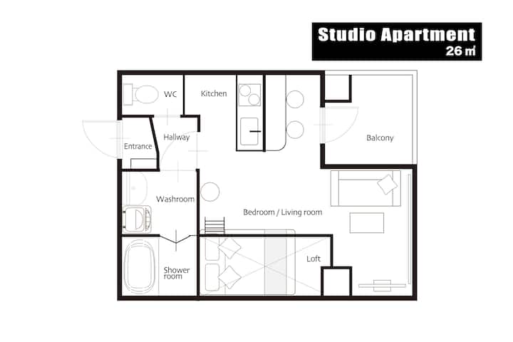 GF62 สตูดิโอสวย! 1 กม./เดิน 14 นาทีถึงสวนสันติภาพ!