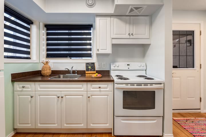 การออกแบบเขตร้อนที่กว้างขวางและเปิดโล่งพร้อมหน้าต่างช่วยให้คุณเห็นวิวภูเขาที่สวยงาม ห้องครัวประกอบด้วยเตาไมโครเวฟเครื่องชงกาแฟหม้อและกระทะและอื่นๆ