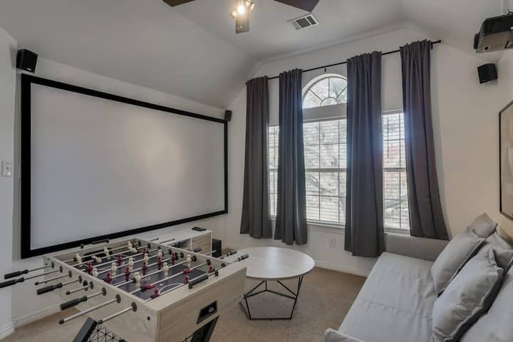ที่พักกว้างขวางแห่งนี้มีสระว่ายน้ำส่วนตัวที่เหมาะสำหรับการว่ายน้ำและห้องดูหนังที่เหมาะสำหรับคืนดูหนังที่อบอุ่นกับคนที่คุณรัก ตั้งอยู่ในย่านที่เงียบสงบคุณอยู่ห่างจากสถานที่ท่องเที่ยวในท้องถิ่นและชีวิตในเมืองดัลลัสที่มีชีวิตชีวาเพียงไม่กี่นาทีห้องครัวที่ทันสมัยห้องนอนที่หรูหราและพื้นที่นั่งเล่นที่กว้างขวางให้ความสะดวกสบายและมีสไตล์สำหรับการเข้าพักของคุณ ไม่ว่าคุณจะวางแผนสังสรรค์กับครอบครัวหรือพักผ่อนกับเพื่อนๆที่พักของเรามีบรรยากาศที่เหมาะสำหรับการสร้างความทรงจำที่น่าจดจำ
