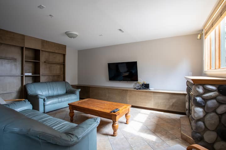 ลงไปชั้นล่างที่พื้นที่สำหรับครอบครัวที่อบอุ่น มีโซฟาที่สะดวกสบายและทีวีสำหรับค่ำคืนดูหนัง ชั้นนี้ยังมีห้องน้ำพร้อมน้ำอุ่น/ฝักบัวและการเข้าถึงอ่างน้ำร้อนที่คุณสามารถผ่อนคลายและเพลิดเพลินไปกับวิวภูเขา