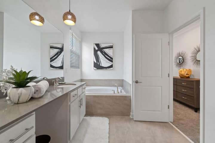 ห้องนอนใหญ่ 2 ห้องของเรามีห้องน้ำในตัวที่สวยงาม และห้องนอนอีก 3 ห้องอยู่ห่างจากห้องน้ำแยกต่างหาก 3 ห้อง สิ่งอำนวยความสะดวกที่ยกระดับได้แก่กระเบื้องเซรามิกพรมขนปุยไฟจี้และงานศิลปะนามธรรม เรายังมีอ่างอาบน้ำสี่อ่างให้คุณเลือกมากมายสำหรับเวลาอาบน้ำตอนเย็นกับเด็กๆ