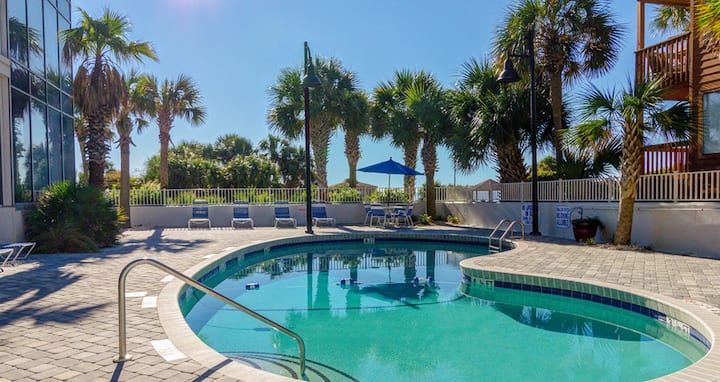 คอนโดน่ารักแห่งนี้ตั้งอยู่ในฟอเรสต์ดูนส์รีสอร์ทในส่วนที่เงียบสงบของไมร์เทิลบีชที่เรียกว่า "คาบาน่าโรว์""รีสอร์ทของเรามีแม่น้ำขี้เกียจสระว่ายน้ำขนาดใหญ่อ่างน้ำร้อนสระว่ายน้ำในร่มและสระว่ายน้ำสำหรับเด็ก นอกจากนี้ยังมีร้านอาหารตามฤดูกาลในสถานที่พร้อมบาร์และศูนย์ออกกำลังกายเต็มรูปแบบ ยูนิตนี้สามารถนอนได้ผู้ใหญ่ทั้งหมด 4 คนและเด็กทารก 1 คน 2 คนในห้องนอน 2 คนอยู่บนโซฟาแบบกางออกและผู้เข้าพักตัวเล็กอีก 1 คนอยู่ในเปลเด็ก
