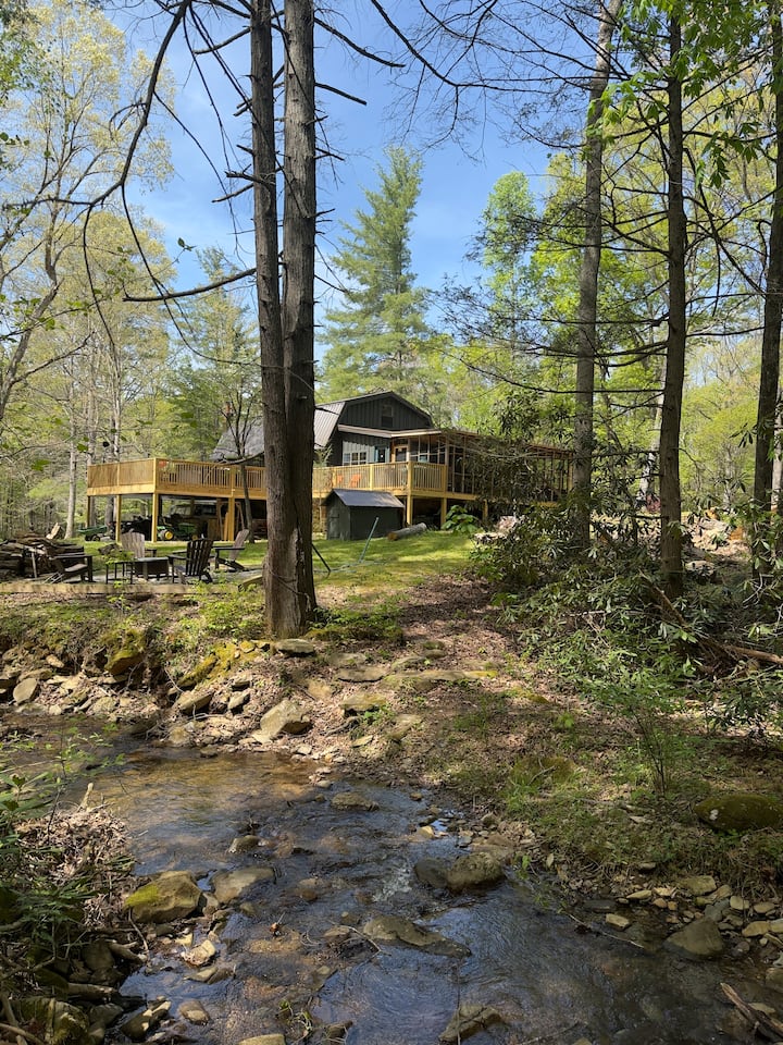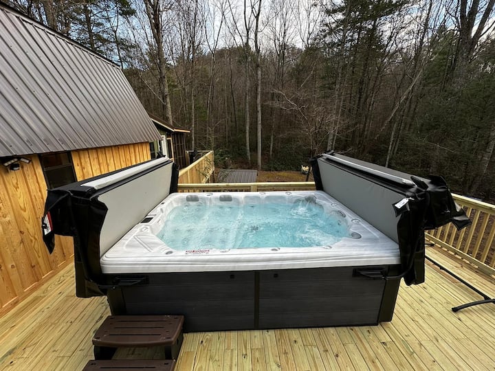 พื้นที่กลางแจ้งส่วนตัวกว้างใหญ่เต็มไปด้วยเคบิน 3 ห้องนอนบนพื้นที่ 3 เอเคอร์ตั้งอยู่บนพื้นที่ 3 เอเคอร์ตั้งอยู่บนป่าสงวนแห่งชาติเชอโรกี อ่างน้ำร้อนขนาดใหญ่ (มีเก้าอี้นั่งเคียงข้างกันตั้งอยู่บนดาดฟ้า 24X24 ฟุตที่มองเห็นลำห้วย)