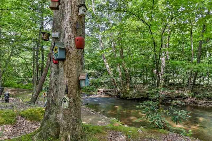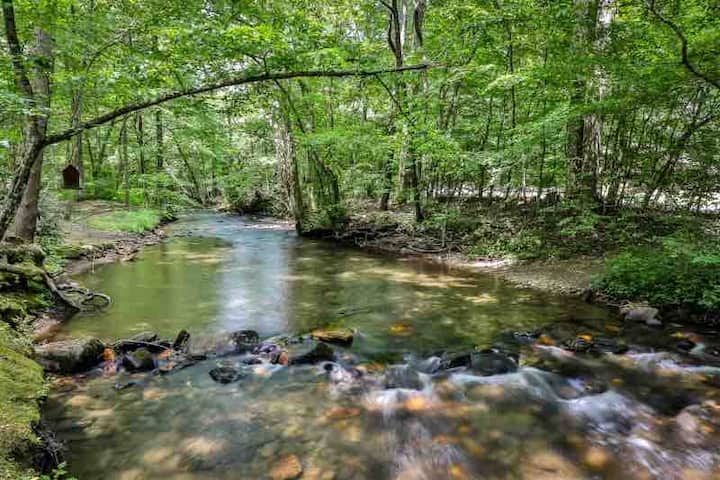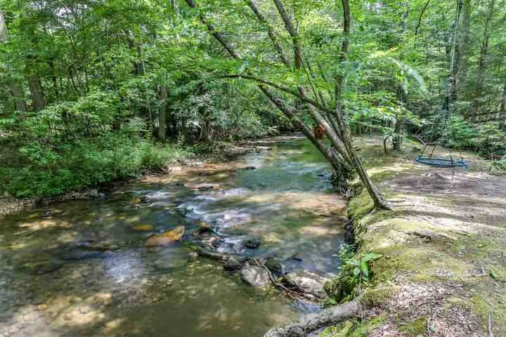 เคบินสวยงามที่มีลำธารอยู่ด้านหน้า ตกปลา อ่างน้ำร้อน