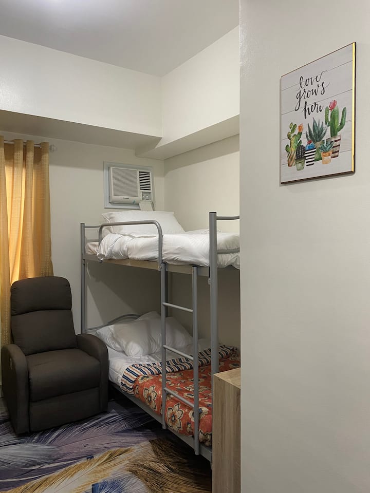 ที่พักเป็นห้องสตูดิโอขนาด 16 ตร.ม. ตกแต่งครบครันใหม่เอี่ยมมองเห็นวิว 90 องศาที่สวยงามของ Alabang, Skyway และ Laguna de Bay เหมาะสำหรับการพักผ่อนทางเลือกสำหรับการทำงานที่บ้านหรือสำหรับครอบครัวที่ต้องการพักผ่อนและเพลิดเพลินกับการอยู่ด้วยกัน เป็นที่พักที่สร้างขึ้นใหม่และมีรายละเอียดที่ซับซ้อนด้วยเฟอร์นิเจอร์ทุกชิ้นเป็นของใหม่และลดเชื้อทุกการจอง มีที่จอดรถแบบเสียค่าบริการในบริเวณใกล้เคียง