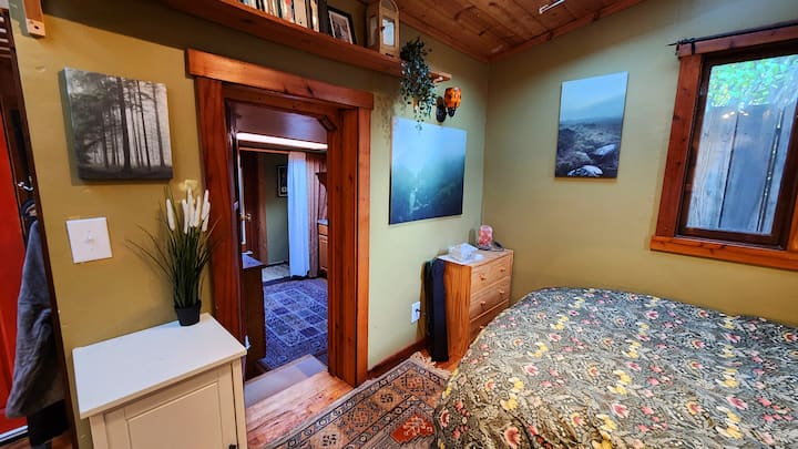พื้นที่บ้าน "ฮอบบิท" ที่น่าสนใจนี้เป็นห้องส่วนตัวที่สุดที่ฉันมี แม้ว่าจะรู้สึกเหมือนอยู่ในสถานที่พักผ่อนในห้องส่วนใหญ่ในบ้านของฉันห้องบ้านฮอบบิทมหัศจรรย์มีการตั้งค่าที่เหมือนการพักผ่อนมากที่สุด มีเสน่ห์ที่ไม่เหมือนใครรวมถึงพื้นสีโอ๊คมีช่องแสง 3 ช่องและหน้าต่างหลายบานที่มองเห็นต้นสายน้ำผึ้งและส่วนต่างๆของสวนหลังบ้าน ห้องพักมีเตียงขนาดใหญ่พร้อมที่นอนซีรีส์ "อเล็กซานเดอร์ซิกเนเจอร์" (ขนาดกลางแข็งแรงพร้อมเมมโมรี่โฟม) โต๊ะและเก้าอี้ตู้เสื้อผ้าตู้เล็กและชั้นวางของที่มีหนังสือที่น่าสนใจมากมายให้คุณเลือกอ่าน ห้องพักไม่มีห้องนอนติดกันและห้องที่อยู่ติดกันฉันใช้เก็บของและเข้าห้องเพียงสั้นๆเท่านั้น ซึ่งหมายความว่านี่จะเป็นห้องที่เงียบที่สุดในบ้านเพื่อความเป็นส่วนตัวของคุณและไม่ได้ยินเสียงผู้เข้าพักคนอื่น มีผ้าปูที่นอนและผ้าเช็ดตัวสะอาดผนังเป็นสีอโวคาโดหน้าต่างและประตูตกแต่งด้วยไม้แดง รับแรงบันดาลใจจากศิลปะบนผนังและหน้าต่างในขณะที่คุณมองนกและกระรอก