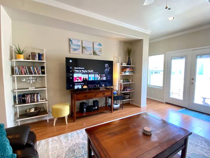 รวมเพื่อนและครอบครัวในพื้นที่นั่งเล่นข้างใน/ข้างนอกที่กว้างขวางของคุณ พร้อมระเบียงขนาดใหญ่ที่เชื่อมต่อเข้ากับห้องครัวและห้องนั่งเล่นสำหรับครอบครัวที่มีอุปกรณ์ครบครัน
