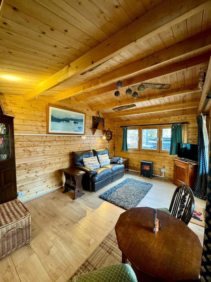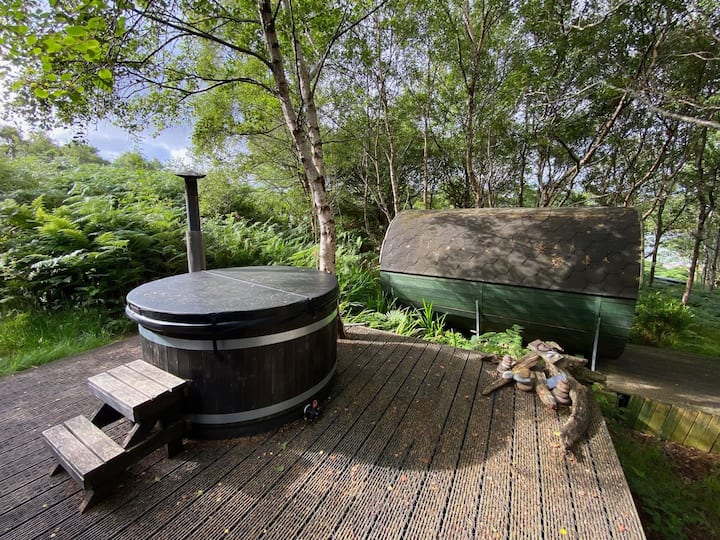 เคบินไม้อบอุ่นและอ่างน้ำร้อนทรงกระบอก สุนัขเข้าพักได้