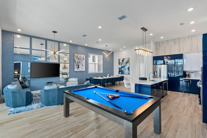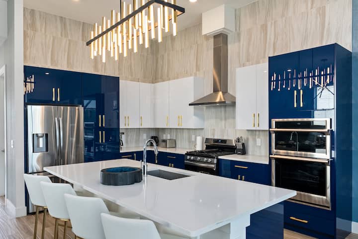 ห้องครัว/ห้องรับประทานอาหาร: ก้าวเข้าสู่ห้องครัวที่คุ้มค่าซึ่งเป็นสวรรค์สำหรับมหากาพย์มี cabinetry สีฟ้าและสีขาวที่เพรียวบางโคมไฟระดับไฮเอนด์ร่วมสมัยและพื้นไม้ที่สดใส เติมเต็มผลงานชิ้นเอกในห้องครัวของเชฟที่เปิดโล่งและโปร่งสบายหาของว่างที่บาร์อาหารเช้าหรือมารวมตัวกับแก๊งของคุณที่โต๊ะรับประทานอาหารยาวและสง่างามที่เหมาะสำหรับงานเลี้ยง