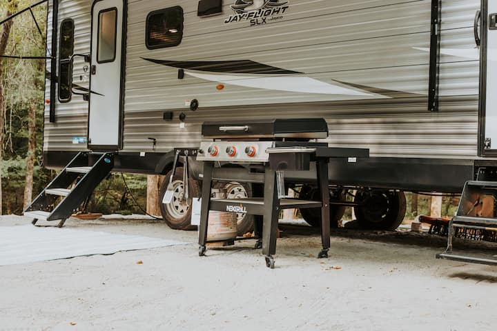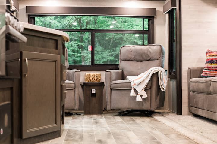 รถบ้านสบายๆ อยู่ใกล้ลำห้วยและล้อมรอบด้วยธรรมชาติ