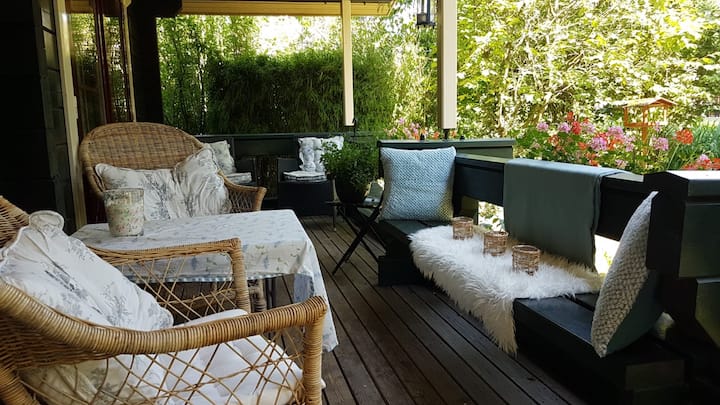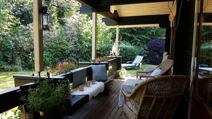 บ้านไม้ที่อบอุ่นพร้อมเฉลียงริมน้ำ