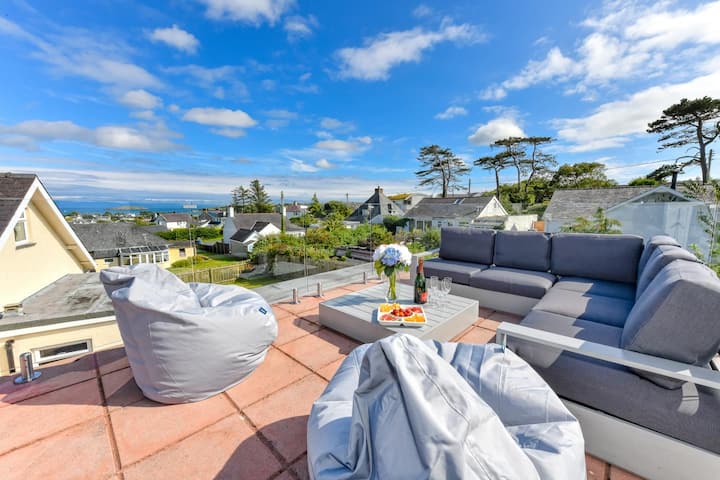 - ระเบียงขนาดใหญ่ที่เชื่อมจากพื้นที่รับประทานอาหารพร้อมโซฟามุมที่สะดวกสบายและราวบันไดกระจกแบบไร้ขอบเพื่อให้มองเห็นวิวทะเลและไปยังเกาะเซนต์ทัดวอลส์ได้อย่างไม่มีสิ่งกีดขวาง