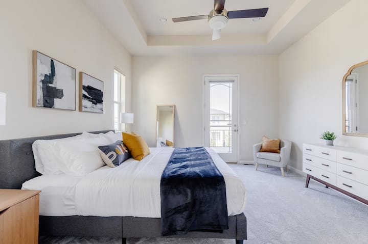 ห้องนอนหลักที่🛏️สะอาดพร้อมเตียงคิงไซส์และดาดฟ้าวอล์คเอาท์ (ดูพระอาทิตย์ขึ้น)