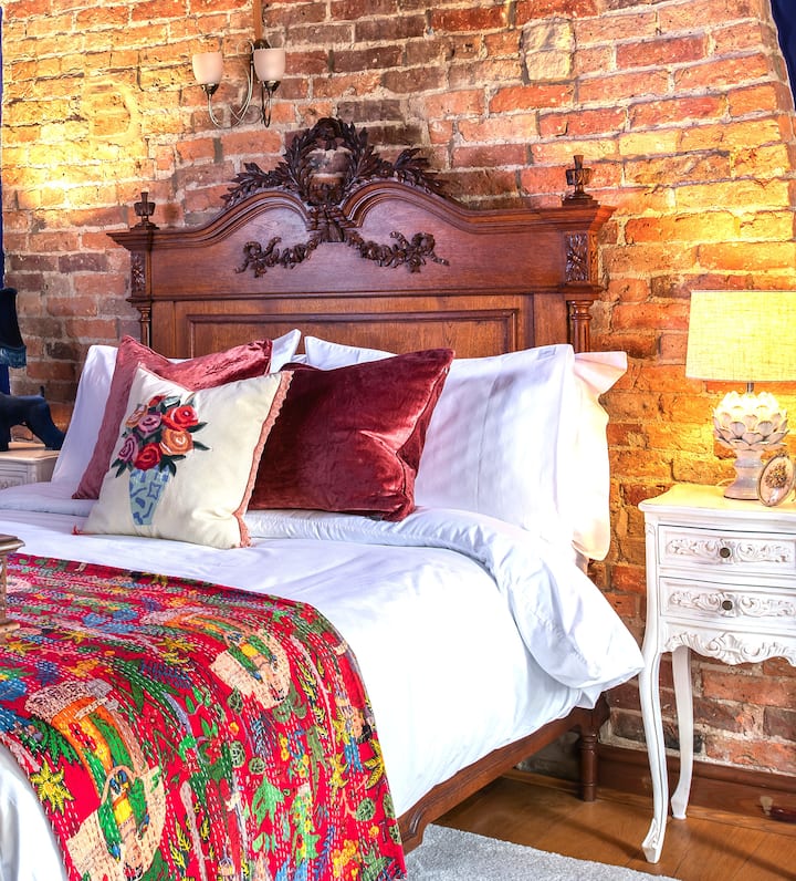 ห้อง Loom เก่าพร้อมเตียงคู่สไตล์ฝรั่งเศสที่สวยงามและโรแมนติกพื้นที่นั่งเล่นที่สะดวกสบายสำหรับการสนทนาที่ยาวนานหรือดูหนังด้วยกัน