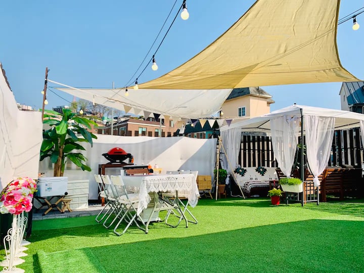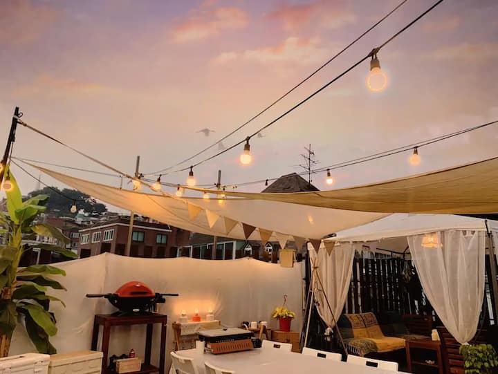 Noksapyeong Rooftop Party Space คือ Mossot คุณสามารถจัดปาร์ตี้บาร์บีคิวบนดาดฟ้าที่กว้างขวางของนัมซานวิว