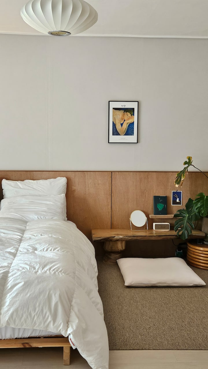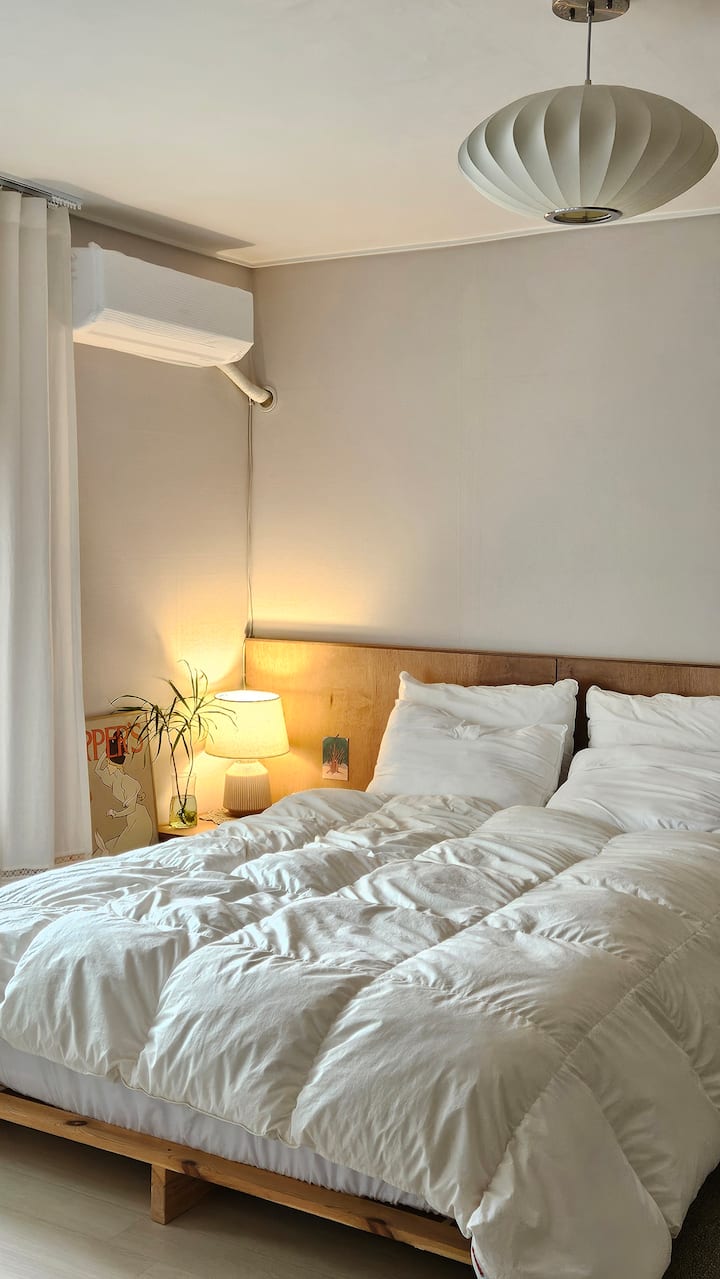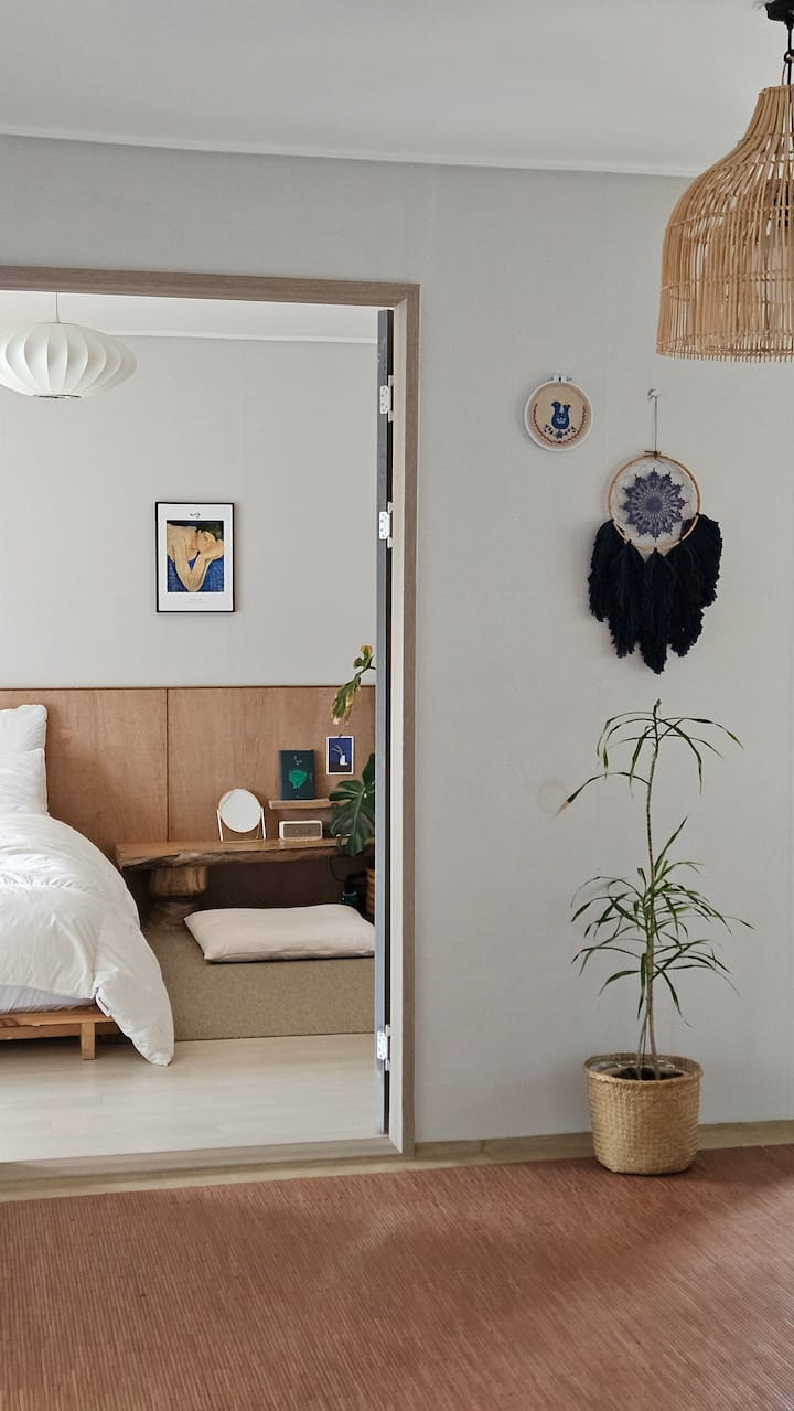 มีบ้านสไตล์คันทรีเชจูและห้องเล็กๆที่มีการพักผ่อนที่อบอุ่น