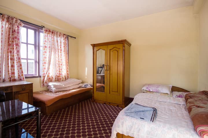 เราใช้ห้องพัก 3 ห้องและห้องอาบน้ำ 1 ห้องที่ใช้ร่วมกับเตียงคู่และเตียงเดี่ยวครอบครัวผู้อยู่อาศัยใช้อีก 5 ห้องแผนที่เมืองกาฐมาณฑุ