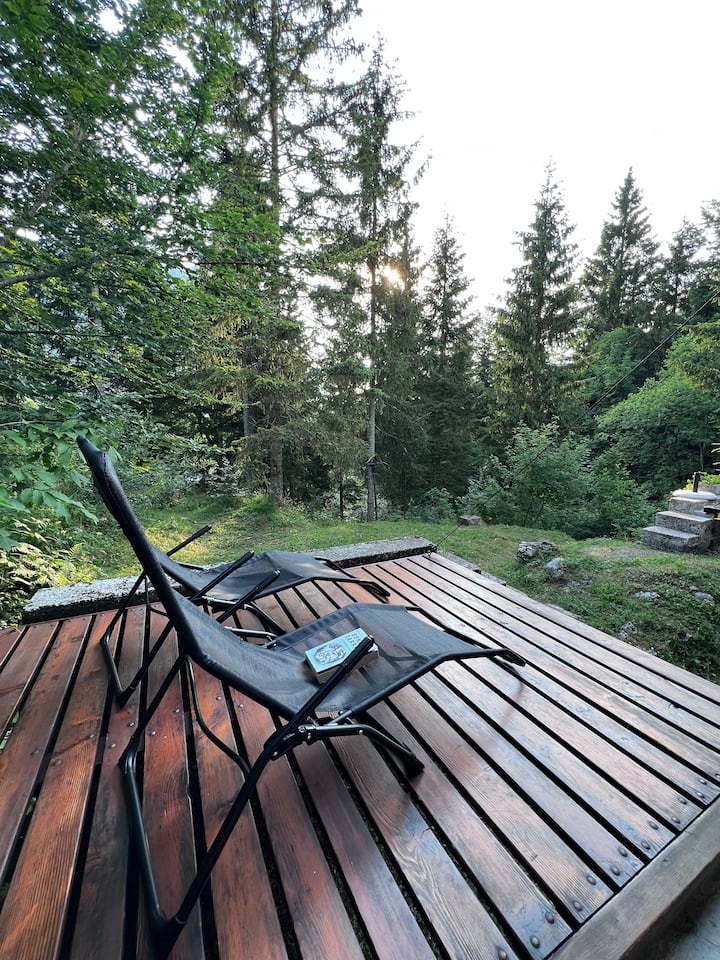 ~ ชาเล่ไม้พร้อมระเบียงที่มองเห็นวิวป่า