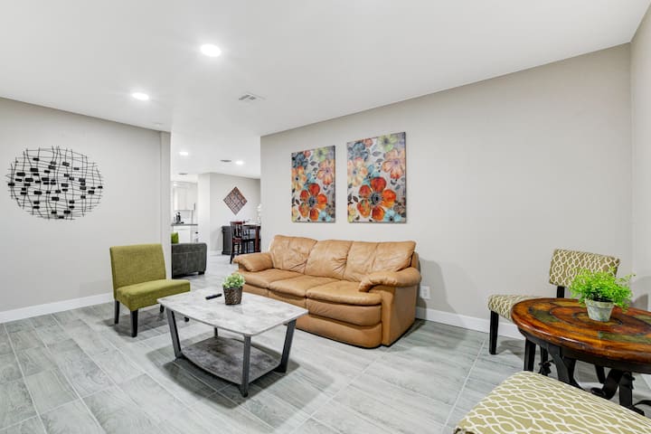 ห้องนั่งเล่น: ผ่อนคลายในพื้นที่นั่งเล่นที่สะดวกสบายในขณะที่เพลิดเพลินกับรายการโปรดของคุณบนสมาร์ททีวีขนาด 50 นิ้วพร้อมบริการสตรีมมิ่งเช่น Netflix, Hulu และ Amazon Prime หน้าต่างบานใหญ่เติมเต็มพื้นที่ด้วยแสงธรรมชาติและเรายังมีบอร์ดเกมและปริศนาเพื่อเพิ่มความสนุกสนาน