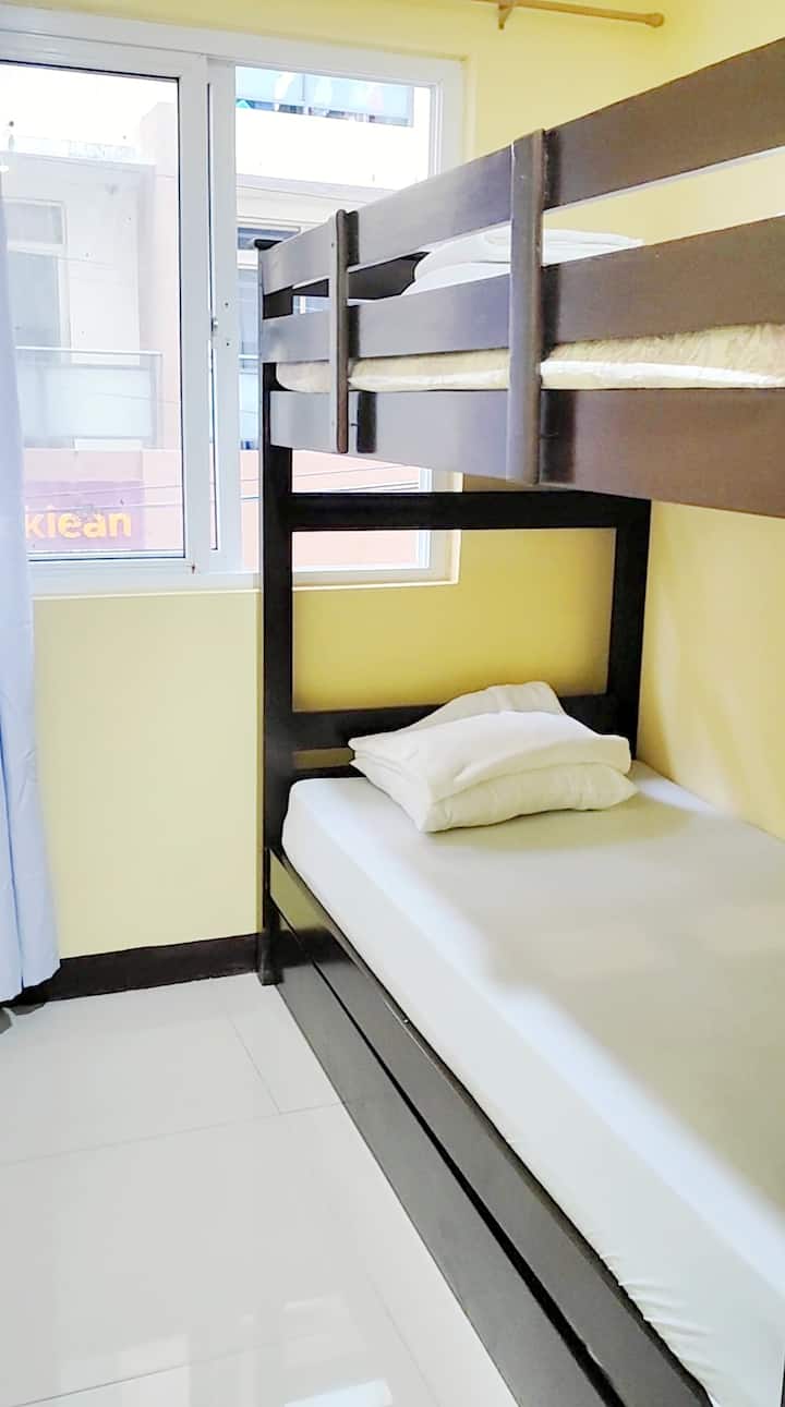 ห้องชุดคอนโด 2 ห้องนอนนี้มีการตกแต่งภายในแบบบ้านที่อบอุ่น มีเตียงควีนไซส์ 1 เตียงและเตียงสองชั้นพร้อมเตียงแบบดึงออก