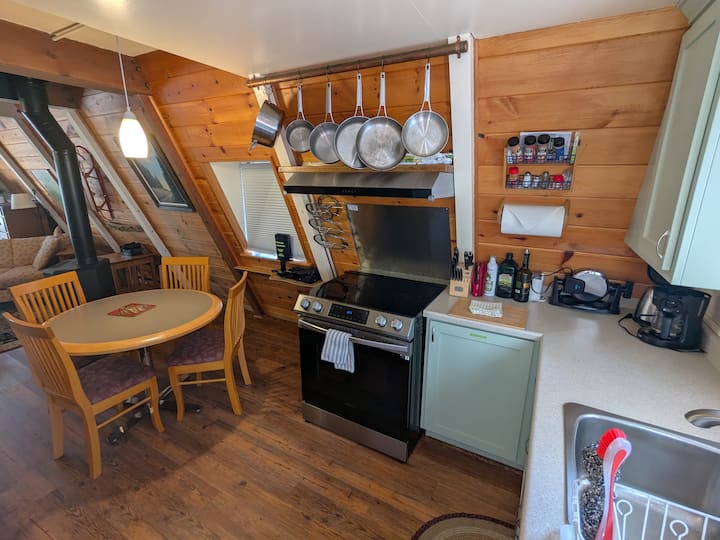 โต๊ะอาหารทรงกลมมีพื้นที่นั่งเล่นที่สะดวกสบายสำหรับ 4 คน พื้นที่เคาน์เตอร์และตู้เก็บของที่ได้รับการปรับปรุงใหม่ได้รับการจัดเตรียมไว้สำหรับการเตรียมอาหารที่มีประสิทธิภาพ สำหรับปี 2024 ห้องครัวมีเตาแม่เหล็กไฟฟ้าใหม่เครื่องดูดควันและอุปกรณ์ทำอาหาร Calphalon ห้องน้ำกระเบื้องหินธรรมชาติอยู่ชั้นล่างติดกับตู้เก็บอาหารข้างห้องครัว ประตูหลังห้องครัวนำไปสู่ดาดฟ้าขนาดกลางที่มองเห็นสวนหลังบ้านที่เต็มไปด้วยป่า ในช่วงฤดูร้อน/ฤดูใบไม้ร่วงดาดฟ้ามีโต๊ะนอกชานพร้อมเก้าอี้และอุปกรณ์ทำอาหารกลางแจ้งโดยใช้ตะแกรงไฟฟ้า