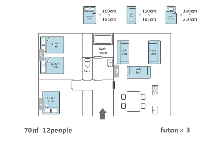 อพาร์ตเมนต์นี้มีเตียงควีนไซส์ 3 หลังเตียงโซฟาเดี่ยว 3 หลังและฟูกนอนเดี่ยว 3 หลังและสามารถรองรับผู้เข้าพักได้สูงสุด 12 คน