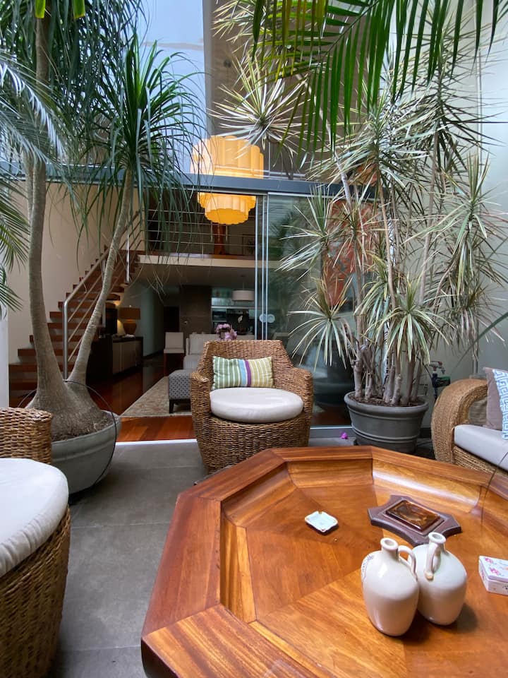 ห้องนั่งเล่นพิเศษสำหรับ 2 คน มีแสงธรรมชาติ พรมเปอร์เซีย และโซฟาที่นั่งสบาย งานศิลปะขนาดใหญ่ที่เต็มไปด้วยความอบอุ่นและความเป็นตัวตน บันไดด้านข้างนำไปสู่ชั้นลอย Ao fundo, o pátio interno repleto de plantas transmite frescor e serenidade